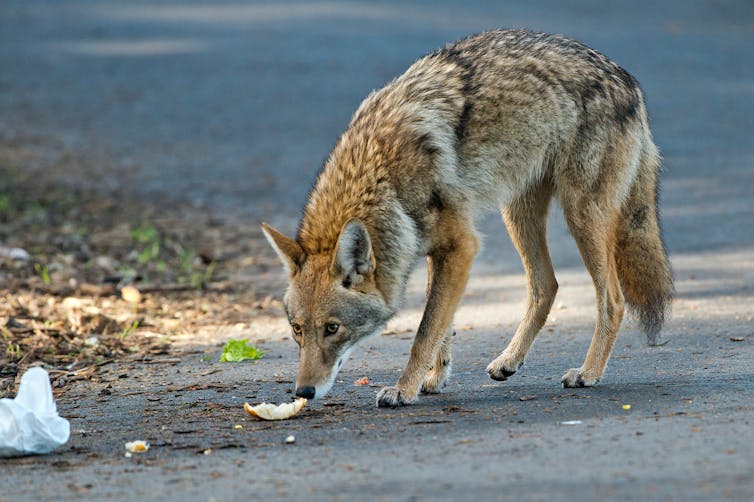 Habituation may lead to proximity issues, which can cause conflict if it is coupled with food conditioning — the intentional or unintentional feeding of coyotes. This arises when people fail to keep yards free of food attractants like dog food, bird seed, fallen fruit or compost. A coyote learns to depend on that food source, which can can increase the risk of the coyote guarding food against people and pets.